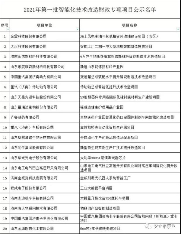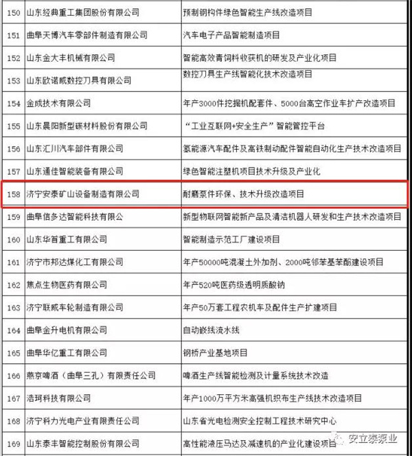 濟(jì)寧安泰礦山設(shè)備制造有限公司(簡(jiǎn)稱安泰泵業(yè))經(jīng)企業(yè)申報(bào)、各市推薦、專家評(píng)審等環(huán)節(jié),入選列入2021年第一批智能化技術(shù)改造財(cái)政專項(xiàng)項(xiàng)目名單,公示時(shí)間為2021年10月11日-15日(5個(gè)工作日)。